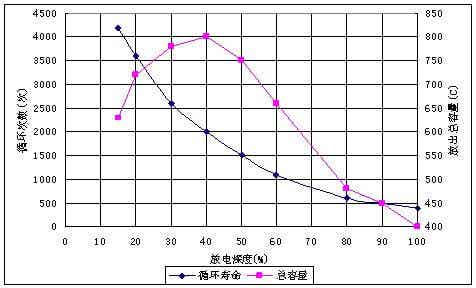 1)放出总容量与放电深度关系不同于循环寿命次数与放电深度关系,是在一定放电深度下有最大放出总容量的曲线。