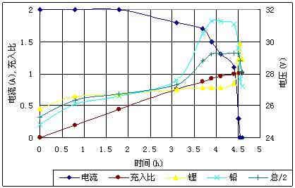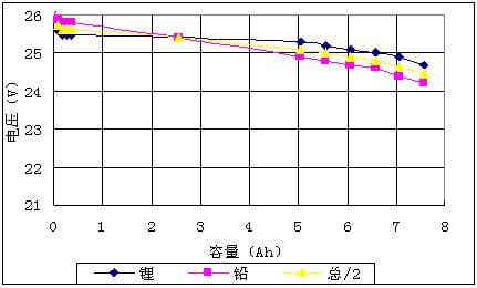 3)充放电特性的互补。图2是混合电池系统和两种蓄电池的充电曲线。锂离子电池充电接受能力优于阀控铅酸蓄电池,而且充电末期电流很小。这样在两种蓄电池构成的串联混合电池系统中,锂离子电池自然成了使阀控铅酸蓄电池基本充满而处于部分菏电状态的设施。图3是混合电池系统和两种蓄电池的放电曲线。从图可见:初期阀控铅酸蓄电池的电压高于锂离子电池;后期离子电池的电压高于阀控铅酸蓄电池;混合电池系统的放电电压介于两者之间,两者起到互补作用。