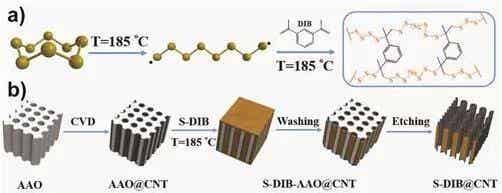 近期,中国科学院金属研究所沈阳材料科学国家(联合)实验室先进炭材料研究部储能材料与器件研究组在高性能多组元复合硫电极材料方面开展了系列研究工作。他们首先采用密度泛函理论计算,以氮掺杂石墨烯作为模型,发现在不同的氮掺杂形式中吡啶氮的团簇能够较强地吸附多硫化物分子,并提出了组元与多硫化物相互作用的能量判断关系。在此基础上,通过氨气高温处理氧化石墨烯的方法,获得了具有优异电化学性能、高含氮量的氮掺杂石墨烯。为了进一步提高对多硫化物的限制效果,将碳纳米管对多硫化物的物理限制作用与有机硫聚合物中碳-硫键对多硫化物的化学限制作用相结合,将有机硫聚合物装填到阳极氧化铝为模板合成出的碳纳米管中,制备出有机硫聚合物/碳纳米管复合材料(图1)。该复合材料通过碳纳米管的管腔物理限制多硫化物溶解,同时利用有机硫聚合物中的碳-硫键进行化学方式固定硫,协同抑制了多硫化物的穿梭效应。