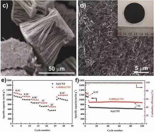 图1 有机硫聚合物(a) 和有机硫聚合物/碳纳米管复合材料(b)的合成示意图;有机硫聚合物/碳纳米管复合材料(c)和膜电极(d)的扫描电镜照片;物理和化学双重限制的有机硫聚合物/碳纳米管与单一物理限制的硫/碳纳米管复合材料的倍率性能 (e)和循环性能(f)对比。
