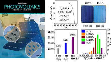 N型双面晶体硅太阳电池由于双面发电特性,广受学术界和产业界的青睐。他们提出了一种简易的双面掺杂(正面BBr3热扩散,背面P离子注入)及薄层Al2O3(~4nm)/SiNx:H (~75nm)的复合膜层钝化p+发射极的方法,经优化峰值烧结温度及精细丝网印刷后,在大面积(238.95cm2)电池上实现正面20.89%和背面18.45%的转换效率。通过软件模拟,在采取正面合理方阻的情况下,该结构n型双面晶硅太阳电池能实现21.32%的转换效率。