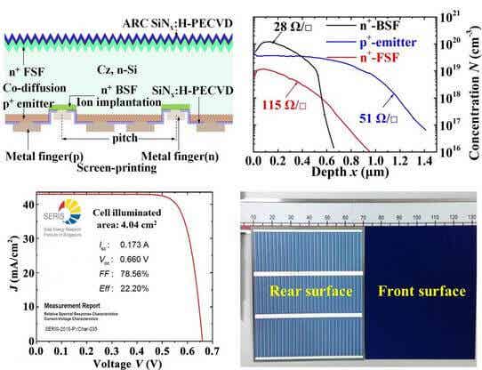 通过湿法化学、共扩散、离子注入及退火氧化、激光图形化和PECVD等工艺,在电池前驱体上实现优越光学表面(平均反射率<2.5%)和较高impliedVoc(0.695V);再经丝网印刷及共烧结后,获得小面积(4.04cm2) BJBC太阳电池22.20%转换效率;运用同样工艺制程,得到较大尺寸(6?6cm2) 21.43%的转换效率。研究展示及论证了该BJBC晶硅太阳电池的制备完全与传统的工业化设备兼容,具有应用前景。