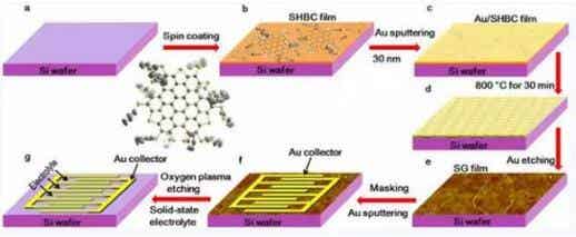 该研究团队利用纳米金薄层的二维纳米限域效应和金催化作用,采用自下而上逐步热解法成功制备出连续、均匀的硫掺杂石墨烯薄膜;以该薄膜为电极,采用微纳加工技术构建微型超级电容器。该电容器具有体积比容量高(582F/cm3),循环稳定性好和功率密度高(1191W/cm3)等优点。机理研究表明,纳米金薄层的存在有利于形成稳定的S-Au键、C-S键,从而实现了纳米石墨烯主体结构完整、硫元素均匀掺杂和薄膜厚度均一。该工作为自下而上法可控制备大面积、连续石墨烯薄膜提供了新思路;也为硫掺杂石墨烯提供了新方法,并证实了硫掺杂能显著提高石墨烯薄膜的电化学性能。
