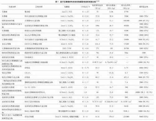 通常来讲,非对称超级电容有更高的工作电压和能量功率密度。从材料的角度来看,基于石墨烯的非对称超级电容的正极材料包括氧化锰、氧化钴、氧化钌、聚苯胺、聚吡咯,纯石墨烯、以及石墨烯与上述材料的复合物;负极材料包括石墨烯,多孔石墨烯,石墨纤维,石墨烯薄膜、石墨/碳纳米管和石墨烯金属氧化物复合物氧化物等。表1总结了目前基于石墨烯材料的非对称超级电容的研究进展,比较了不同石墨烯基非对称超级电容的性能。