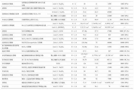 表1显示,石墨烯氧化锰复合物为正极材料,石墨烯或改性的石墨烯复合材料为负极,非对称电容器有相对较高的工作电压和功率能量密度。聚合物与石墨烯的复合物做正极,石墨烯做负极的非对称电容器,利用有机溶液作为电解液,其工作电压可以进一步提高到4V,远高于现在商业化超级电容的工作电压(2.7V)。