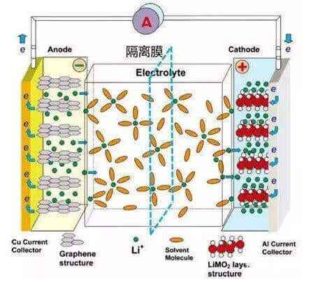 在充电时,电池的正极上有锂离子(Li+)生成,生成的锂离子(Li+)经过电解液从正极运动到负极,而负极的石墨是有微孔的层状结构,到达负极的锂离子(Li+)嵌入到碳层的微孔中,嵌入的锂离子(Li+)越多,充电容量越高;在放电时(即我们使用电池的过程),嵌在负极碳层中的锂离子(Li+)脱出,又运动回正极,回到正极的锂离子(Li+)越多,放电容量越高。我们通常所说的电池容量指的就是放电容量。