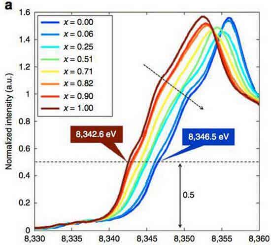 实验中Chen等人首先利用熔盐法合成了单晶LNMO材料,并利用化学氧化法合成具有不同Li浓度的LixNi.Mn1.5O4材料,下图展示了不同Li含量的样品XANES图谱,从图中可以看到随着Li的下降,Ni元素从二价向三价转变,使得图谱向能量更高的一侧转移。