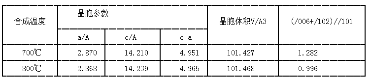 对两种温度下合成LiNi。C02Mn402材料的XRD图谱进行的Rietveld结构。据文献,材料晶胞参数c/a>4.9时代表形成了层状结构,并且该值越大,层状结构形成得越好,从表中的精修结果看出,随温度昀升高,材料晶胞参数中口值减小、c值增加,c/a的值增大,并且c/a均大于4.9,说明两个温度下合成的材料均形成了层状结构,并且随温度的升高层状结构逐渐变好偈。值常被用来判断六方密排结构的有序性,该值代表六方晶体结构的有序性,一般在0.5左右为佳‘知,随温度的升高合成的材料该值减小,六方密排结构的有序性提高。综上,800℃合成的材料具有最佳的层状结构,故选定800℃为合成温度。