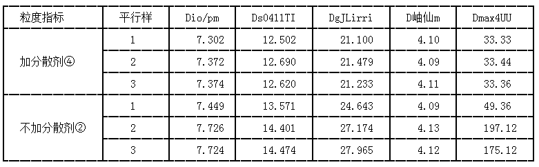 由表中测试结果可知,在保证其他测试条件一致的情况下,样品分散时使用分散剂,三次平行测试结果的一致性好;不使用分散剂时,三次测试结果偏差较大,尤其是Dmax由此可见,样品分散时不加分散剂,样品在水中出现团聚现象,导致Dmax很大而且不均。