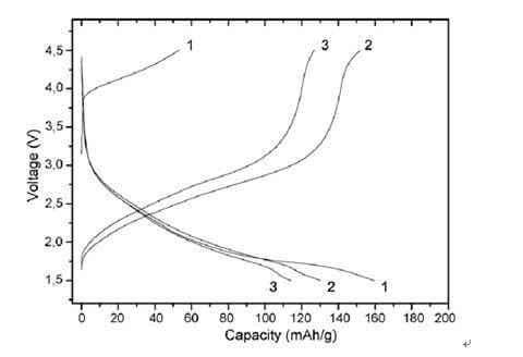 图 1[10] Li/LiPF6(EC,DMC)/α- LiFeO2在C/8下前3次循环的充放电曲线