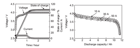 LVP10电池在25℃的环境温度中以10A的恒电流充电至4.0V,接着继续进行合计3小时,以恒电压充时时的充电特性示于图3。本电池进行1小时的充电可从完全放电状态充电至80%以上的充电深度(SOC)。在飞机起飞时电池SOC为较高的状态。所以只有优异的充电接受性