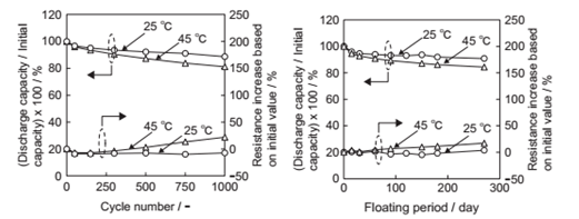 45℃(△)循环时的充放电循环寿命性能。 及4.025V浮充条件下的日历性能。该电池在