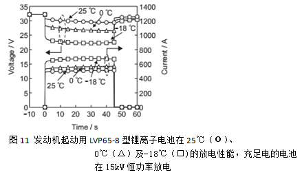 LVP65-8电池组发动机起动放电时的电压变化示于图11。试验条件是在25℃的环境温度中使LVP65-8电池组以70A的恒电流充电到32.2V,接着继续以相同的电压合计充电3小时后,在环境温度25、0及-18℃的条件下进行15kw的恒电流放电。由图得知,放电时的峰值电流温度越低越大,在-18度时超过650A。但是,在这种低温大电流放电的条件下,本电池组也能维持20V以上的电压,具有良好的起动性能。