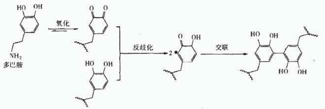 多巴胺在水溶液中(图1),多巴胺(Dopamine)很容易被溶解氧氧化并发生自聚合,形成强力附着于聚合物、金属、陶瓷、玻璃及木材等多种固体材料表面的聚多巴胺(PDA)复合层,其自身的邻苯二酚基团很容易被氧化,生成具有邻苯二醌结构的多巴胺醌混合物。多巴胺和多巴胺醌会发生歧化反应,产生半醌自由基后偶合形成交联键,同时在基体材料表面形成紧密附着的教练复合层。