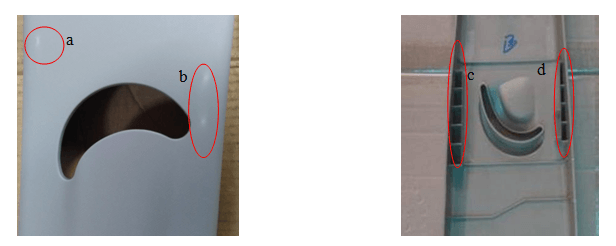 (a)、(b) 为发白的位置靠近不规则椭圆孔位;