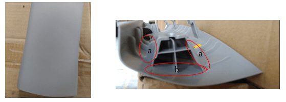 某项目的车门立柱成型后转序至缓存装配区内存放,装配发货时发现,该产品中部两边筋条位置(如:图1)存在批量发白现象,分析原因:由于此前均未出现过此问题,因此认为注塑工艺不恰当导致而成型产品内应力比较大,当产品自然冷却时,收缩应力与内应力释放的引起发白现象。注塑工艺调整方面,适当的提高模温、降低注射压力、保压压力,降低顶出速度,合理的延长冷却时间。以此来减小制品的内应力,改善应力发白现象。