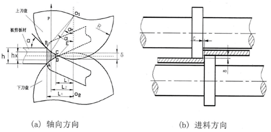 (1)极片分切时,上下圆盘刀具有后角,类似与剪刀刀刃,刃口宽度特别小。上下圆盘刀不存在水平间隙(图1中所示参数c相当于负值),而是上下刀相互接触并存在侧向压力。