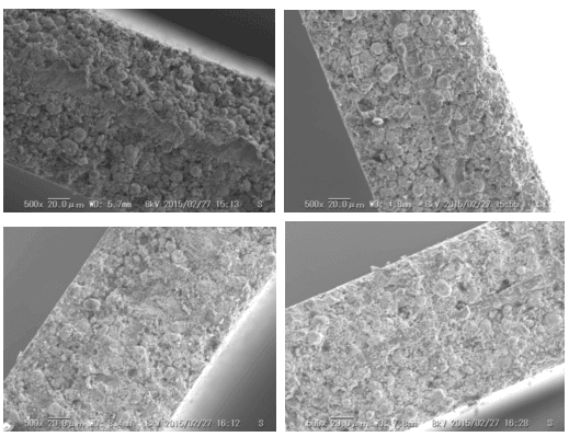 毛刺,特别是金属毛刺对锂电池的危害巨大,尺寸较大的金属毛刺直接刺穿隔膜,导致正负极之间短路。而极片分切工艺是锂离子电池制造工艺中毛刺产生的主要过程。图3所示即为极片分切产生的金属毛刺的典型形貌,极片在分切时形成了集流体毛刺,尺寸达到100μm以上。表1是LiFePO4极片分切毛刺实验结果,通过切刀倒角、刀具侧向压力以及收放卷张力的调节来控制毛刺的数量和尺寸。