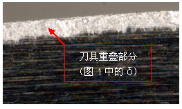 极片分切圆盘刀存在侧向压力,上下刀具在刀刃口侧面相互重叠,连续分切过程中,刃口局部承受的应力大且集中,由于频繁的挤压、剪切、摩擦和循环交变的机械载荷作用,在刃口区易出现疲劳微裂纹,继而在循环应力的作用下,会沿着圆盘刀侧面向中心扩展,当裂纹增长到一定程度,应力达到刀具材料的强度极限时就会造成刀具刃口的局部微破损。