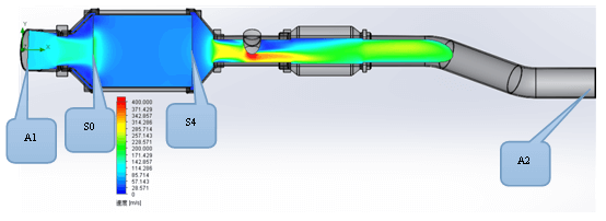 图2是两个项目催化器内部流体速度场分布云图,从图中可知,项目1和项目2的气流速度在整体上趋势相近,无太大区别。经分析,最大速度区域皆位于氧传感器周围,这与实际情况非常吻合,因传氧感器只有当气流速度达到150m/s以上才能进行探测工作。为方便分析背压及速度,用A1代表催化器入口面,A2代表催化器出口面,S0代表催化体前端面,S4代表催化体后端面面,如图2(a)所示。