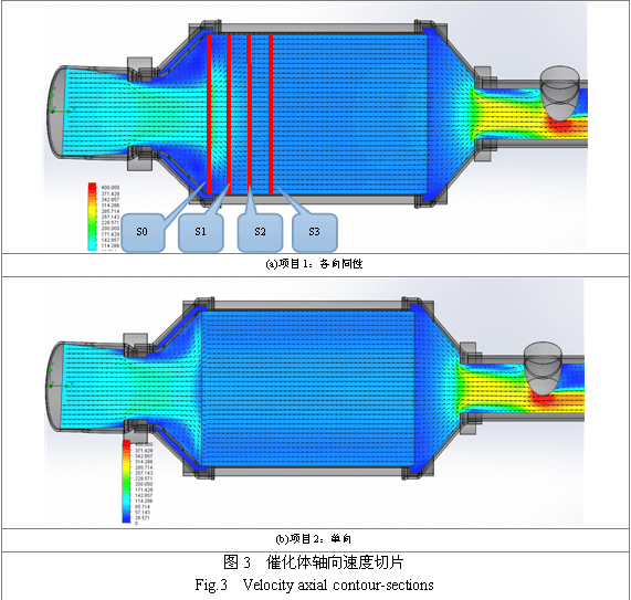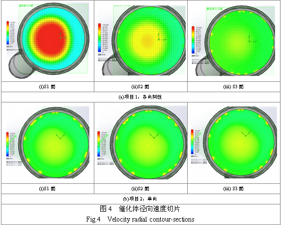 图3是两个项目催化体轴截面速度场带矢量的云图,图4是对两个项目制作多个径向截面速度切片,所取切片位置示于图3(a)中,与S0分别相距10mm(S1)、20mm(S2)、30mm(S3),以便观察气体在催化体内部的流动特性。