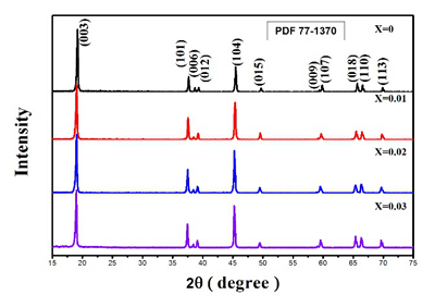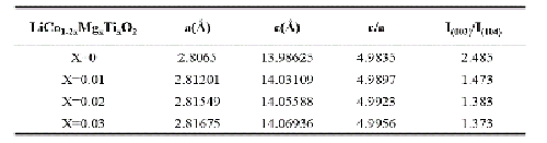Table 1. The crystal lattice parameters of LiCo1-2xMgxTixO2(x=0, 0.01, 0.02, 0.03)samples