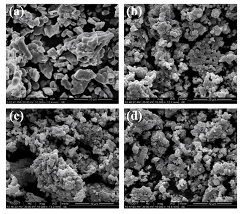 图2. LiCo1-2xMgxTixO2 (a) x=0, (b) x=0.01, (c) x=0.02和(d) x=0.03样品的SEM图像