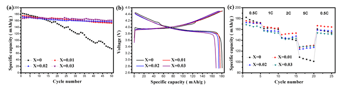 图3. LiCo1-2xMgxTixO2(x=0, 0.01, 0.02, 0.03)样品 (a)循环曲线,(b)充放电曲线,(c)倍率曲线