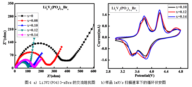 图4b)是各个Li3V2(PO4)3-xBrx样品在1mV/s扫描速率下的循环伏安图。由图中可以看出,充电过程中总共有4个峰,放电过程中总共有3个峰。充电时,在 3.6~3.7V出现了两个峰,对应2.3节中的第1个和第2个充电平台,原因是有一个V从+3价氧化为+4价,并脱出第一个Li+,晶体结构发生了一定变化[15];在4.1V附近出现了第3个峰,对应2.3节中第3个充电平台,此时剩下的另一个V从+3价氧化成+4;在4.6V左右出现的第4个峰,对应2.3节中的第4个充电平台,这时V从+4价变为+5价。放电过程中三个还原峰分别出现在3.8V、3.57V和3.47V附近。氧化峰与还原峰的位置与文献报道的相近,并且与充放电测试的结果相吻合。