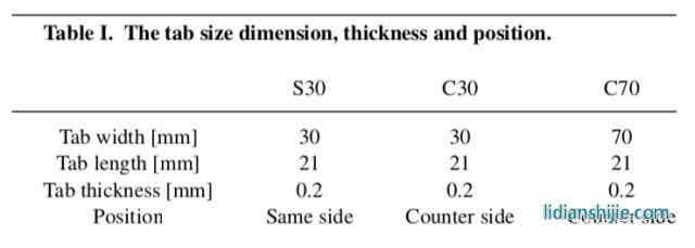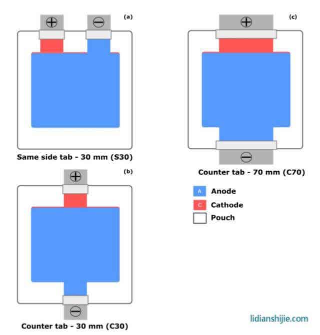 为了验证模型的有效性,作者采用了三种结构的软包电池对实验结果进行验证,三种电池的正极材料均为NCM622材料,负极均为石墨材料,电池容量为16Ah,尺寸为117mm×101mm×11.5mm,其正极、负极和隔膜的结构和尺寸完全一致,仅极耳结构和位置不同(如下图所示),三种电池的极耳结构详细信息如下表所示。