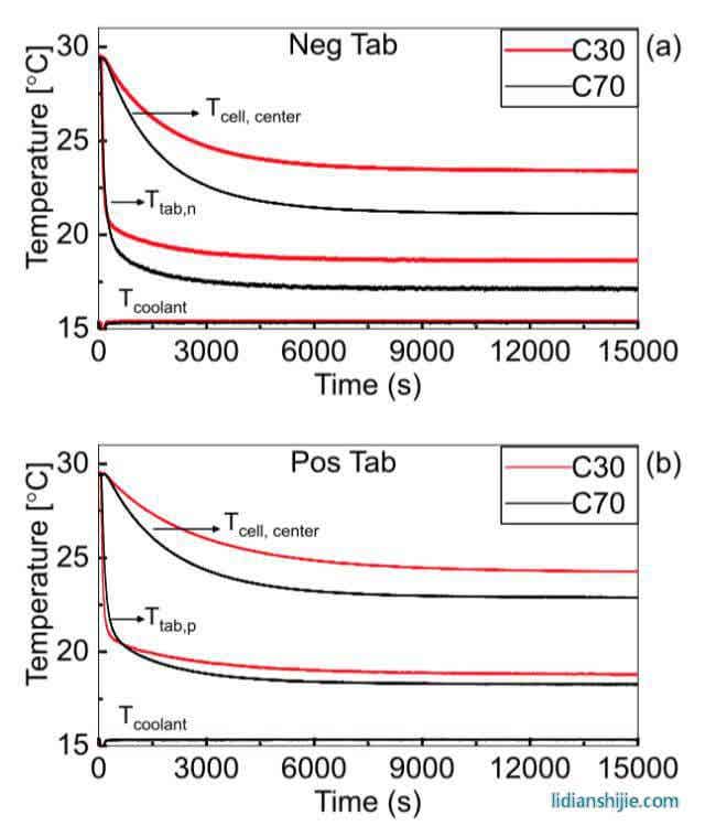 下图为实验中测量的电池中间位置表面、电池极耳和冷却池的温度变化曲线,从下图a(负极极耳冷却)中能够看到相比于窄极耳的C30电池,宽极耳设计的C70电池在中心位置表面温度低2.3℃,在负极极耳位置低1.5℃,从下图b(正极极耳冷却)能够看到宽极耳设计的C70电池在冷却效果上仍然具有优势,在中心位置C70电池的温度低2℃,极耳位置低0.7℃,表明宽极耳设计能够有效的减少电池的热阻,同时相比于正极极耳散热,负极极耳冷却热阻较小,也能够提升散热效果。
