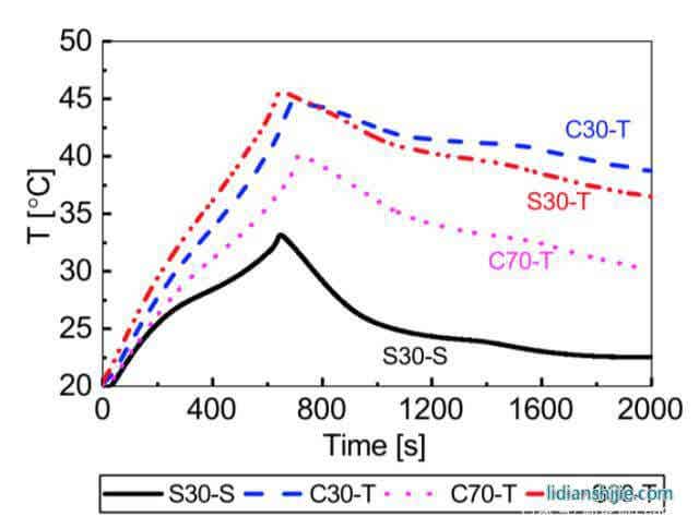 从下图中能够看到采用表面散热的S30电池在整个过程中电池表面的温度最低,在放电结束时的最高温度为33.3℃,采用极耳散热的S30和C30电池温度最高,在放电结束时电池温度分别达到了45.5℃和44.5℃,而采用宽极耳设计的C70电池温度出现了明显的降低,放电结束时的最高温度比窄极耳设计的S30和C30电池低了6℃,表明宽极耳设计能够有效的提升散热效果。