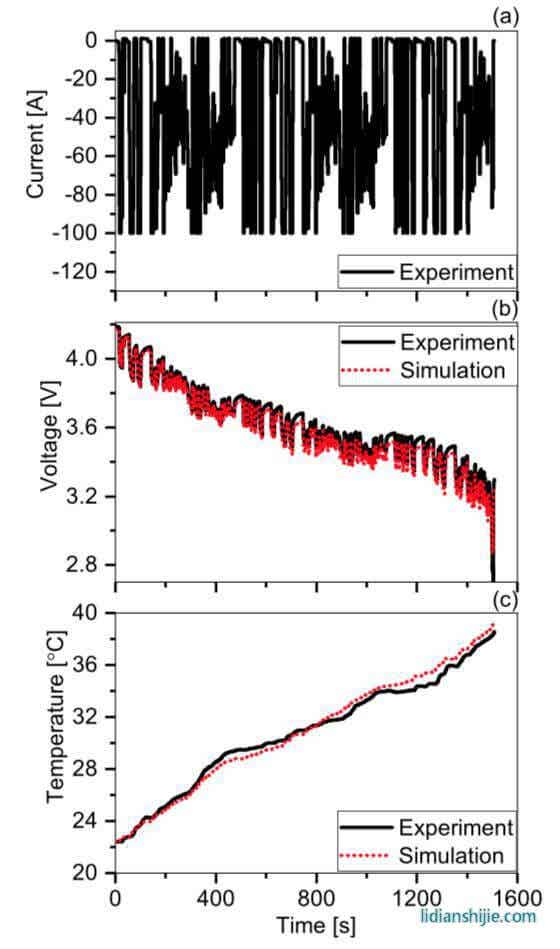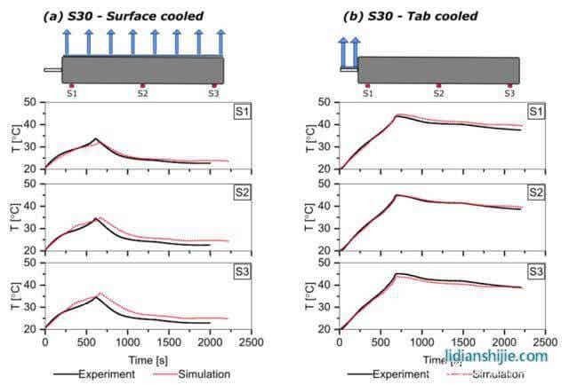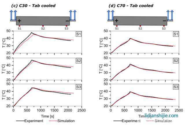 下图为采用模型模拟的三种电池分别采用表面散热、极耳散热方式进行热管理时电池的温度变化曲线,对于采用表面散热的S30电池,模型得到的温度与实际的温度在S3位置最大误差为1.5℃,对于采用极耳散热的C30电池在S1和S3位置的最大误差分别为-1.5℃和1.9℃,对于采用极耳散热的S30和C70电池模型仿真结果与实际结果之间相差不到1℃,表明该模型能够提供可接受精度的温度预测。