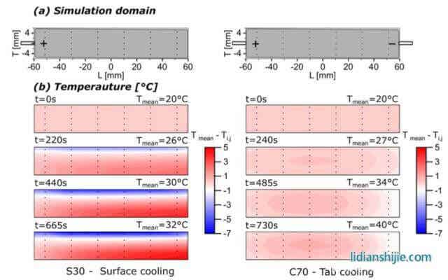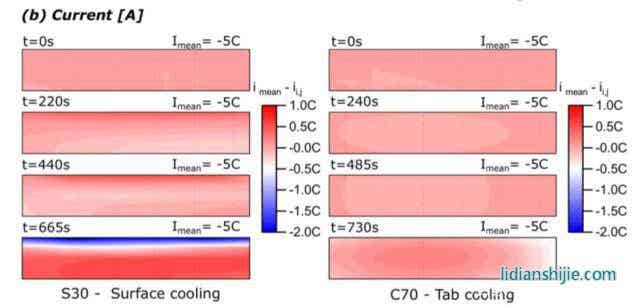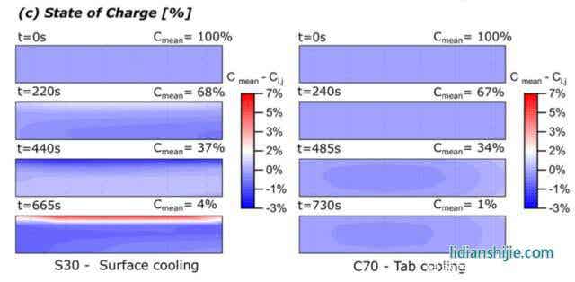 下图为通过模型得到的采用表面散热方式的S30电池和采用极耳散热方式的C70电池内部的温度变化、电流分布变化和局部SoC变化,从下图a我们能够看到由于S30电池通过电池顶部表面散热的方式对电池进行散热,因此能够看到电池内部出现了明显的温度梯度,相比之下采用极耳散热方式的C70电池温度就要均匀的多。