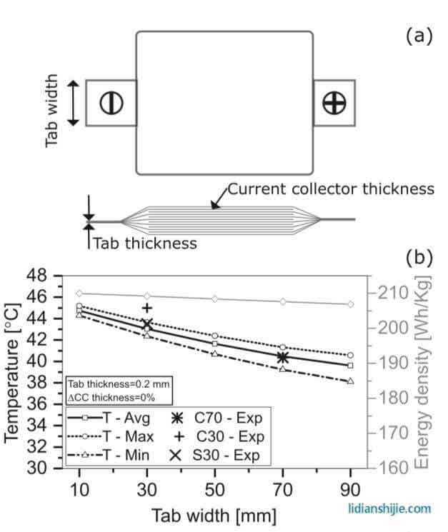 作者以散热效果较好的C70电池作为基础,对极耳的结构进行了优化设计,下图b展示了极耳宽度对于电池在放电过程中的平均温度、最高温度和最低温度的影响,从图中能够看到电池极耳宽度从10mm提高到90mm,放电结束时电池的平均温度从44.5℃下降到了39.5℃,电池在长度方向上的最大温差从1℃增加到了2.4℃,由于极耳重量的增加,电池的重量能量密度从210Wh/kg降低到了207Wh/kg。