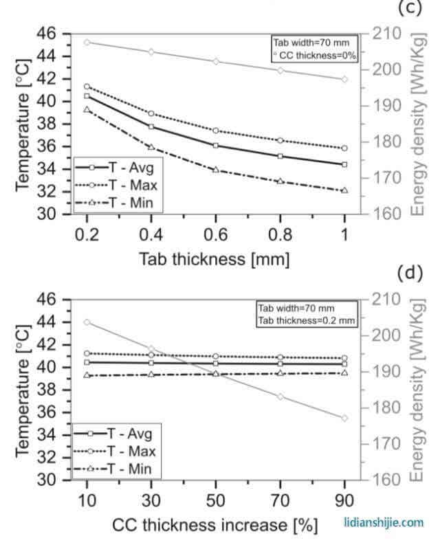 从下图c可以看到当极耳的厚度从0.2mm增加到1mm,电池在放电结束后的平均温度从40.4℃降低到了34.4℃,同时电池内部在长度方向上的温度梯度也从2℃增加到了3.7℃,由于极耳重量的增加,电池的重量能量密度从210Wh/kg下降到了197Wh/kg。