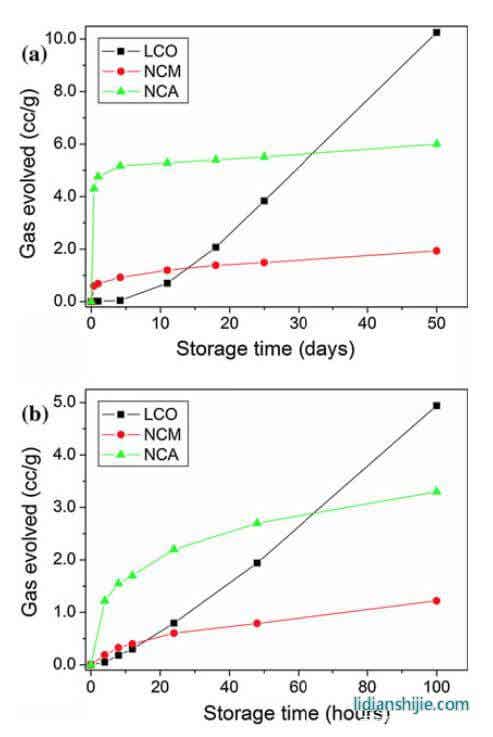 下图b为LCO、NCM和NCA材料在85℃存储过程中的产气行为,从图中能够看到在85℃下存储时三种材料的产气行为与60℃下存储时几乎完全相当,但是产气速度更快。