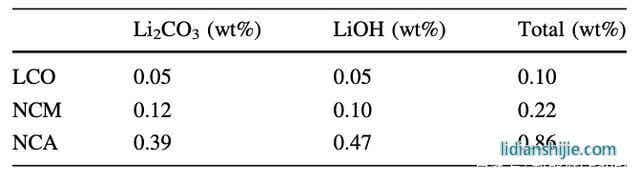 第一性原理计算显示Ni基材料的晶体内部比LCO材料存在更多的肖基特缺陷,从而在晶体内部产生空位,从而形成Li-O化合物,这些化合物则会进一步与水蒸气或CO2等反应,生成LiOH、Li2CO3等杂质。下表为三种材料表面的LiOH、Li2CO3杂质的含量,从表中可以看到相比于LCO材料,NCA和NCM材料表面的LiOH、Li2CO3杂质含量会更高,特别是NCA材料表面的杂质含量可达LCO材料的8-10倍。