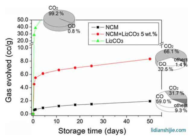 由于NCA和NCM材料表面的LiOH、Li2CO3杂质含量要明显高于LCO材料,因此作者认为NCA和NCM材料高温存储的初期阶段产气比较快主要是受到两种材料表面杂质的影响。为了验证这一观点,作者在NCM材料中掺入了5%的Li2CO3粉末,并进行了高温存储。从下图中产气曲线可以看到在电解液中加入了纯Li2CO3粉末后在存储的初期快速产气,产生的气体成分主要是CO2,而在NCM材料中添加Li2CO3粉末后产气同样大大增加,产生的气体为66%的CO2和32%的CO,纯的NCM材料在电解液中产气较少,32%为CO2,59%为CO,这表明Ni基材料表面的LiOH、Li2CO3杂质是引起高温存储初期产气的主要原因,同时NCM材料自身会与电解液发生副反应,产生CO气体,但是我们仍然对NCM材料与电解液反应只产生CO,还是同时产生CO和CO2不清楚。