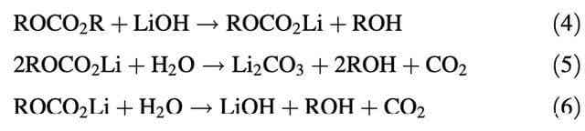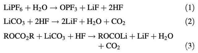 在之前的研究中作者认为H2O是引起电池产气的必要因素,H2O引起LiPF6分解,并产生HF从而引起后续一系列的分解反应,引起电池产气。但是该项实验表明仅有LiPF6存在的情况下也会产生气体,作者认为这可能是因为在实验前电解液中已经存在痕量水,即便是痕量水也能够诱发下式所示的反应。