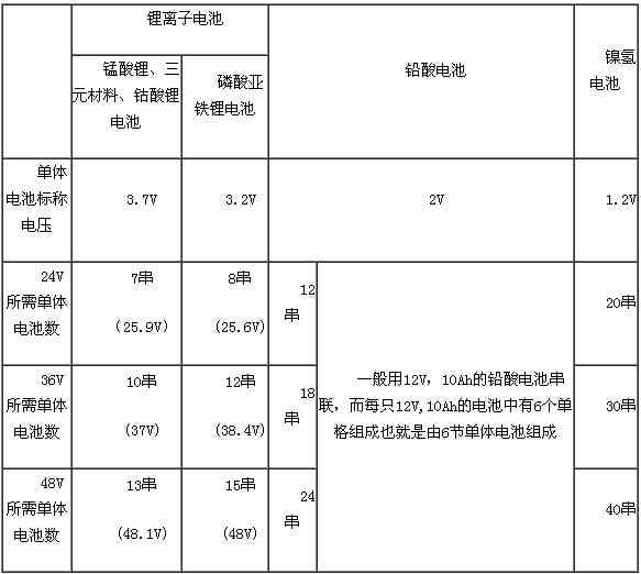 (1) 单体电池工作电压高达3.7V,是镍镉电池, 镍氢电池的3倍,铅酸电池的近2倍,这也是锂电池比能量高的一个重要原因。因此组成相同电压的动力电池组时,锂电池使用的串联数目会大大少于铅酸电池和镍氢电池。如果动力电池中单体电池数量越多,电池组中单体电池的一致性要求就越高,寿命就越不好做,在实际使用过程中电池组有问题分析后,一般是其中一、两个单体电池出问题然后导致整组电池出现问题,因此不难理解为什么48V的铅酸电池比36V的铅酸电池反馈要高,从这个角度上讲锂电更适合动力电池的使用。例如36V的锂电只需要10个单体,而36V铅酸电池需要18个单体电池,即3只12V的电池组,而每只12V的铅酸电池有六个单格即六个单体电池组成。